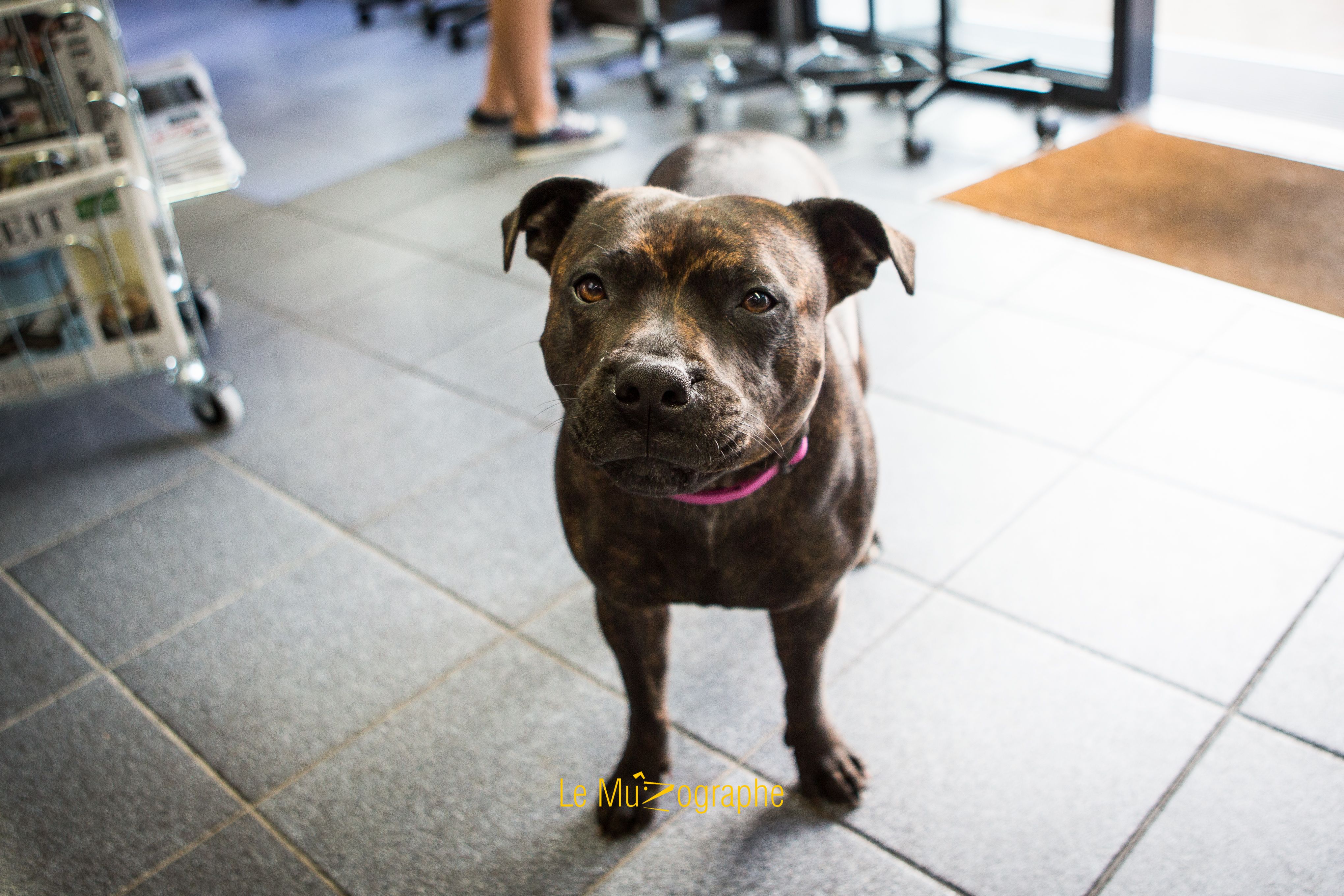 Hizie est une Staffordshire Bull Terrier de deux ans et demie. Un amour de gentillesse. Une célébrité aussi. Hizie est connue de tout le monde, les enfants l’adorent. « Quand elle se promène devant l’école, les enfants l’appellent ». Logique lorsque l’on sait que ce chien est surnommé « nanny dog » (chien nounou) par les Anglais !