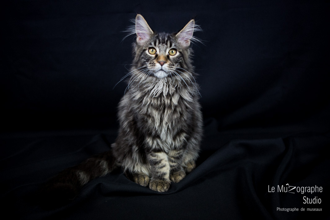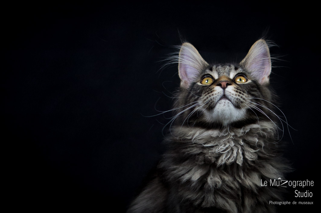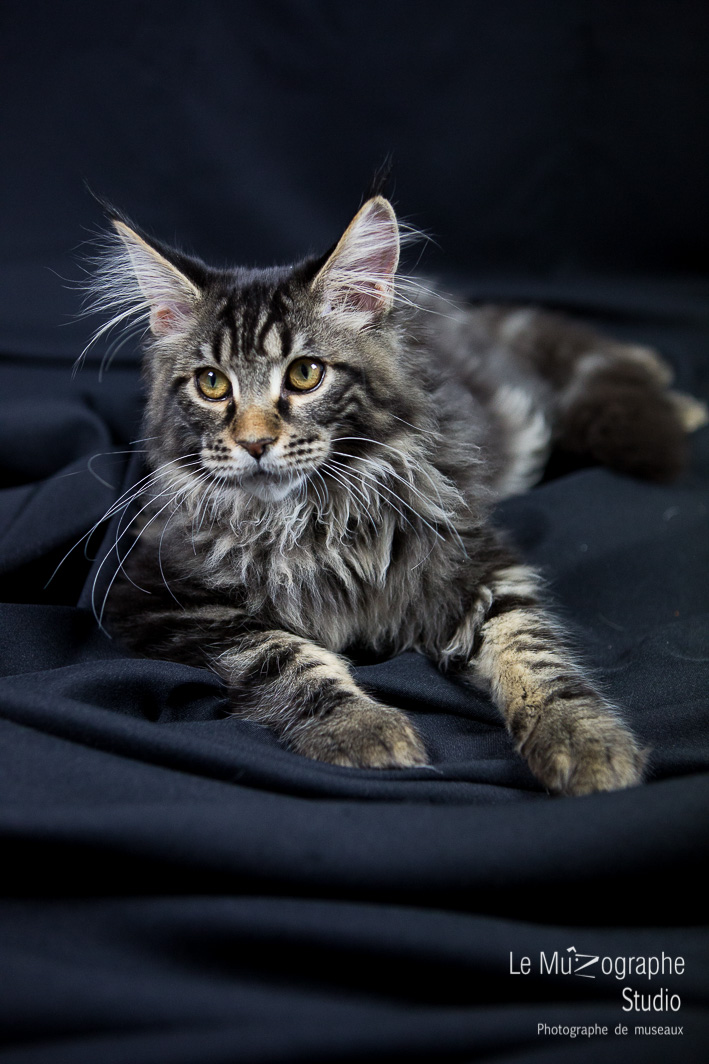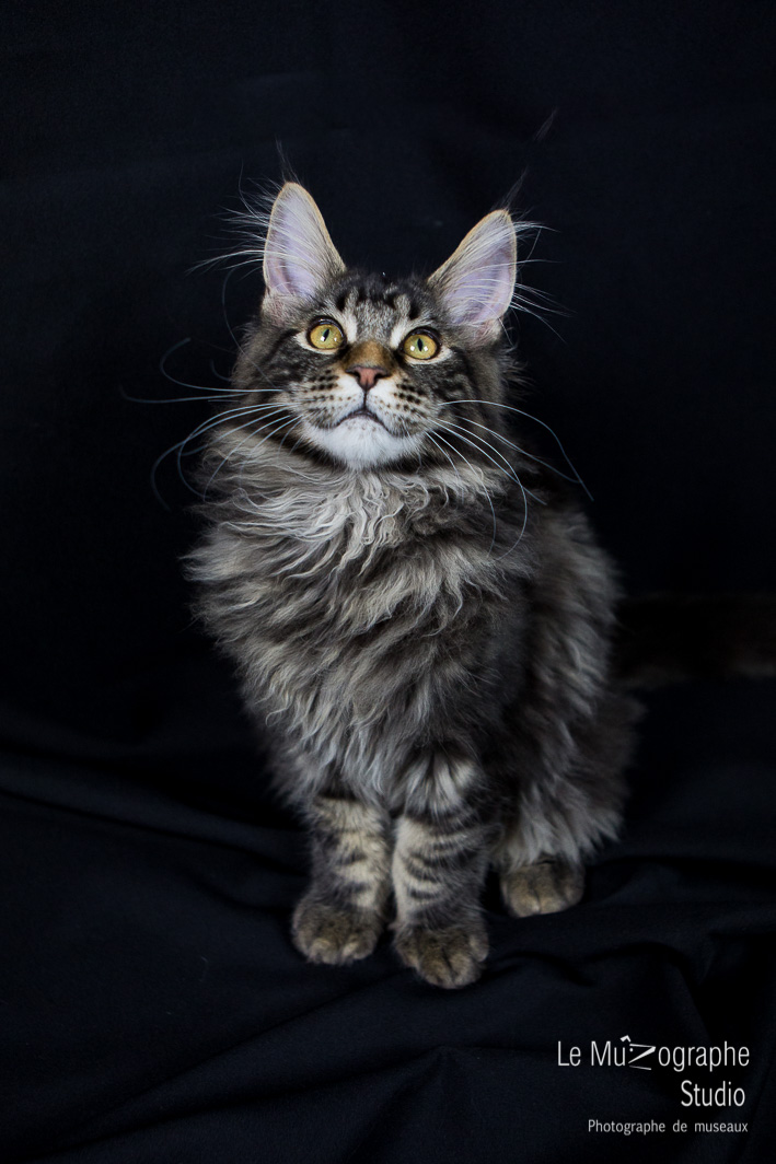 Séance Studio, pour Nadège et son jeune Maine Coon de 4 mois et 4 kilos : Loky des secrets de Loly. Superbe chaton au tempérament paisible et très attachant.