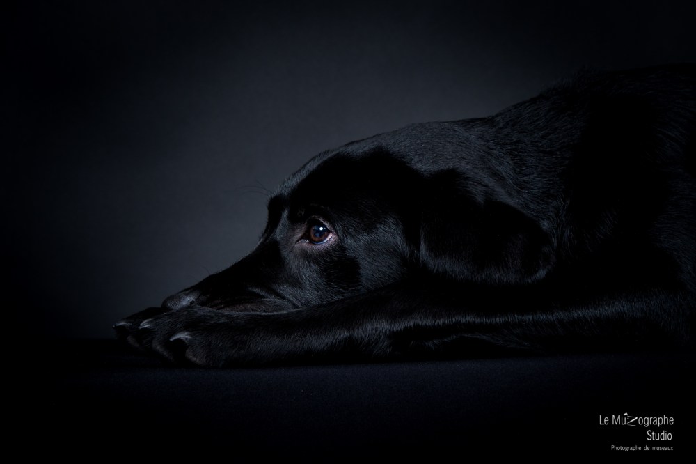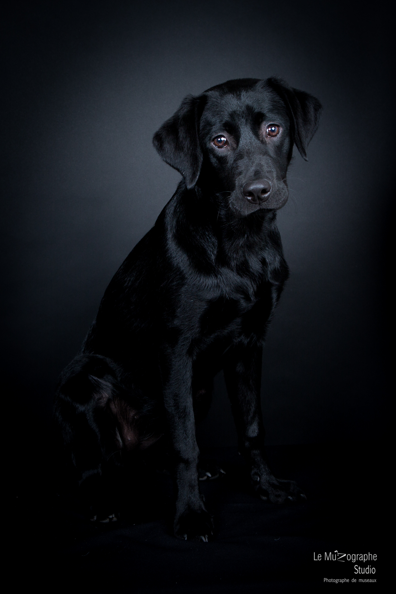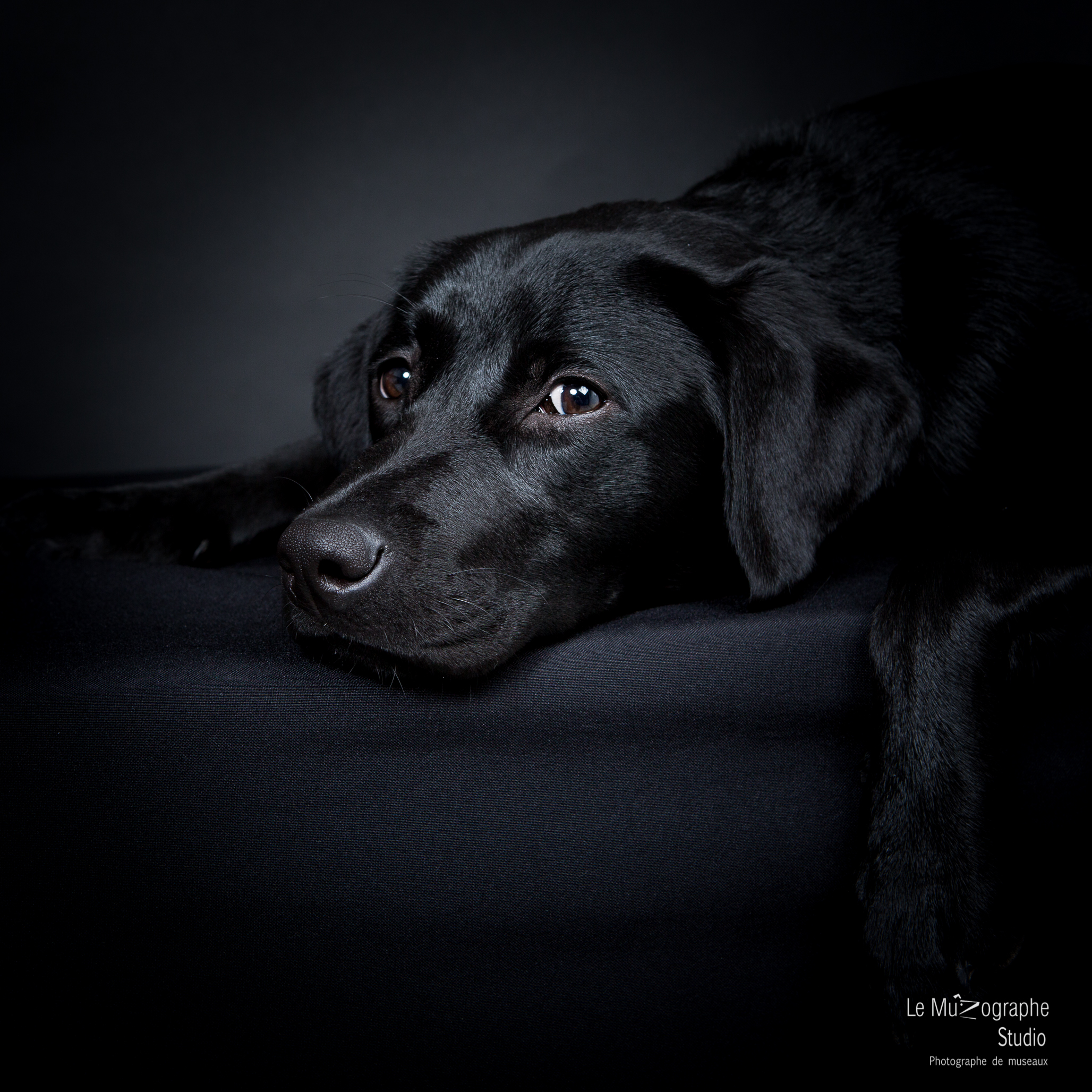 Messi, toute jeune labrador noire de 6 mois au studio du MuZographe. Une séance tout en clair-obscur, avec une recherche de contraste, de profondeur et de lumière sur le regard et la truffe de cette jeune chienne.