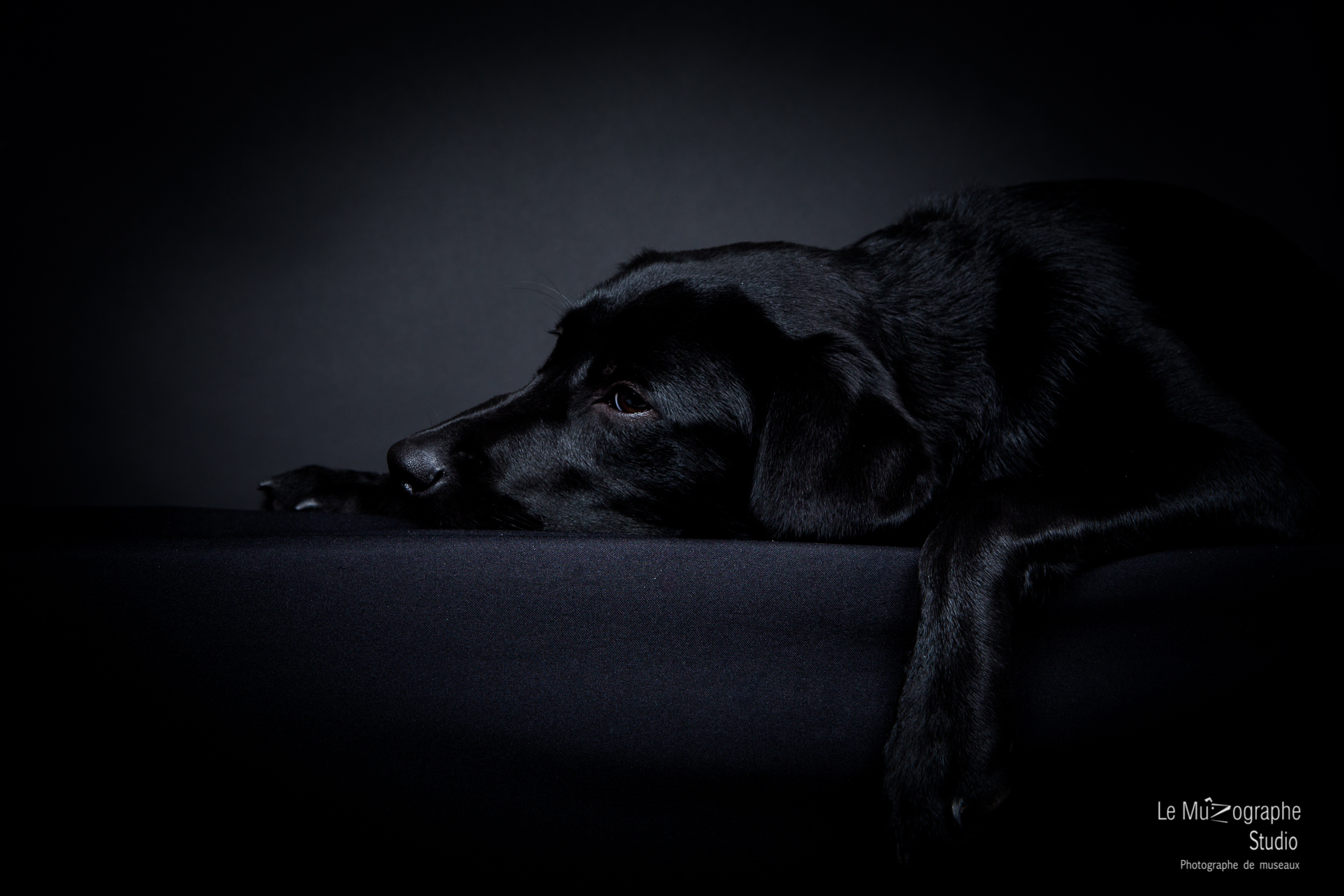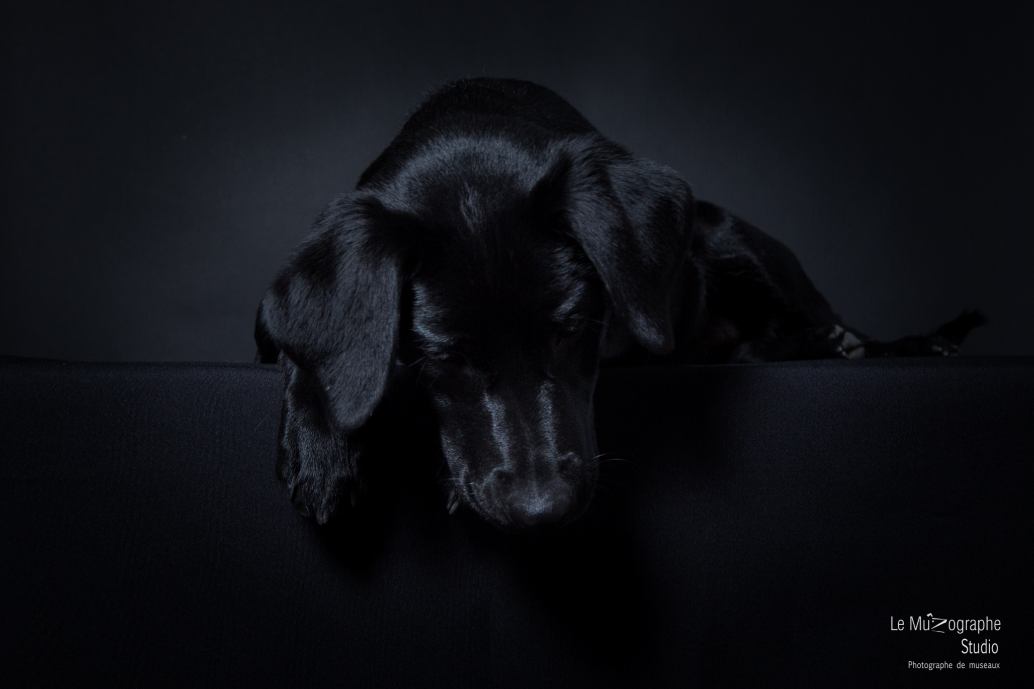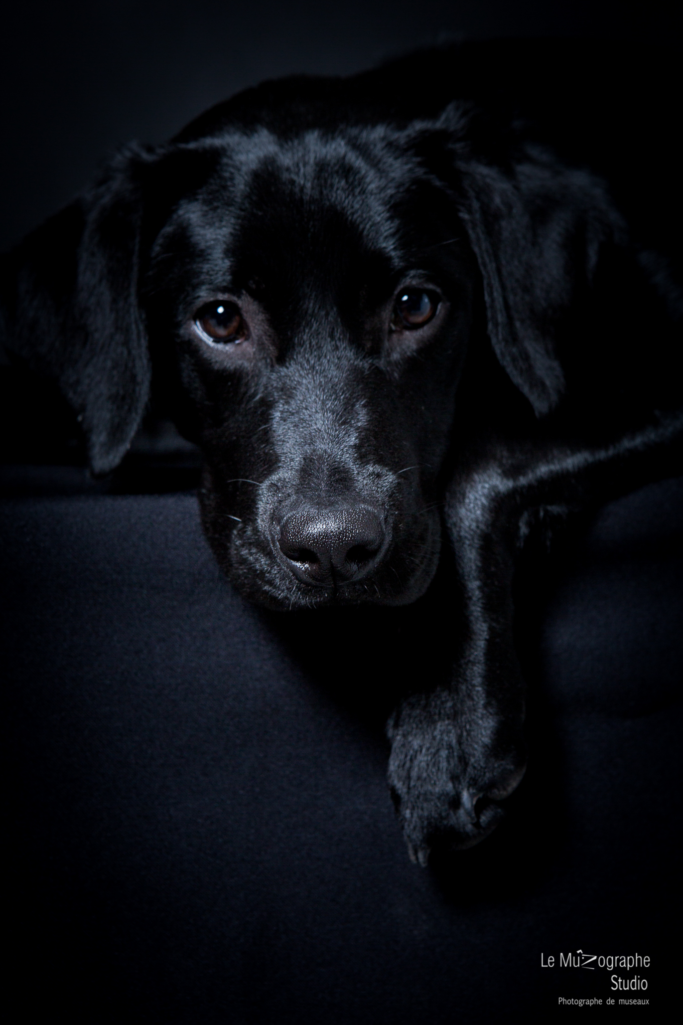Messi, toute jeune labrador noire de 6 mois au studio du MuZographe. Une séance tout en clair-obscur, avec une recherche de contraste, de profondeur et de lumière sur le regard et la truffe de cette jeune chienne.