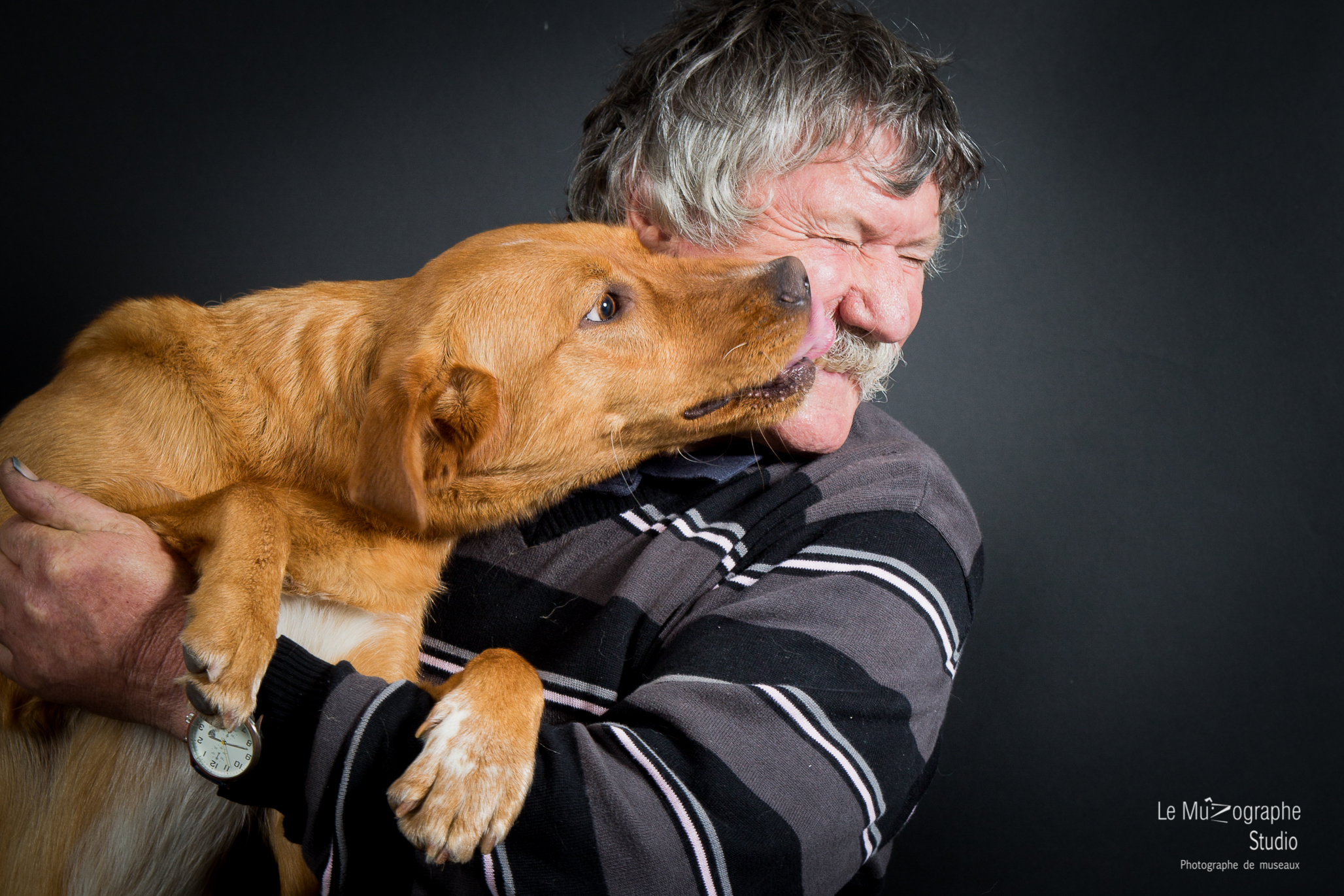Effectivement. A l’arrivée au Studio, René n’avait pas le sourire aux lèvres, et j’ai tout de suite compris que ça n’était pas le style à faire des photos avec un chien ! Mais très rapidement l’ambiance s’est détendue et là j’ai pu assister à une belle leçon d’amour.