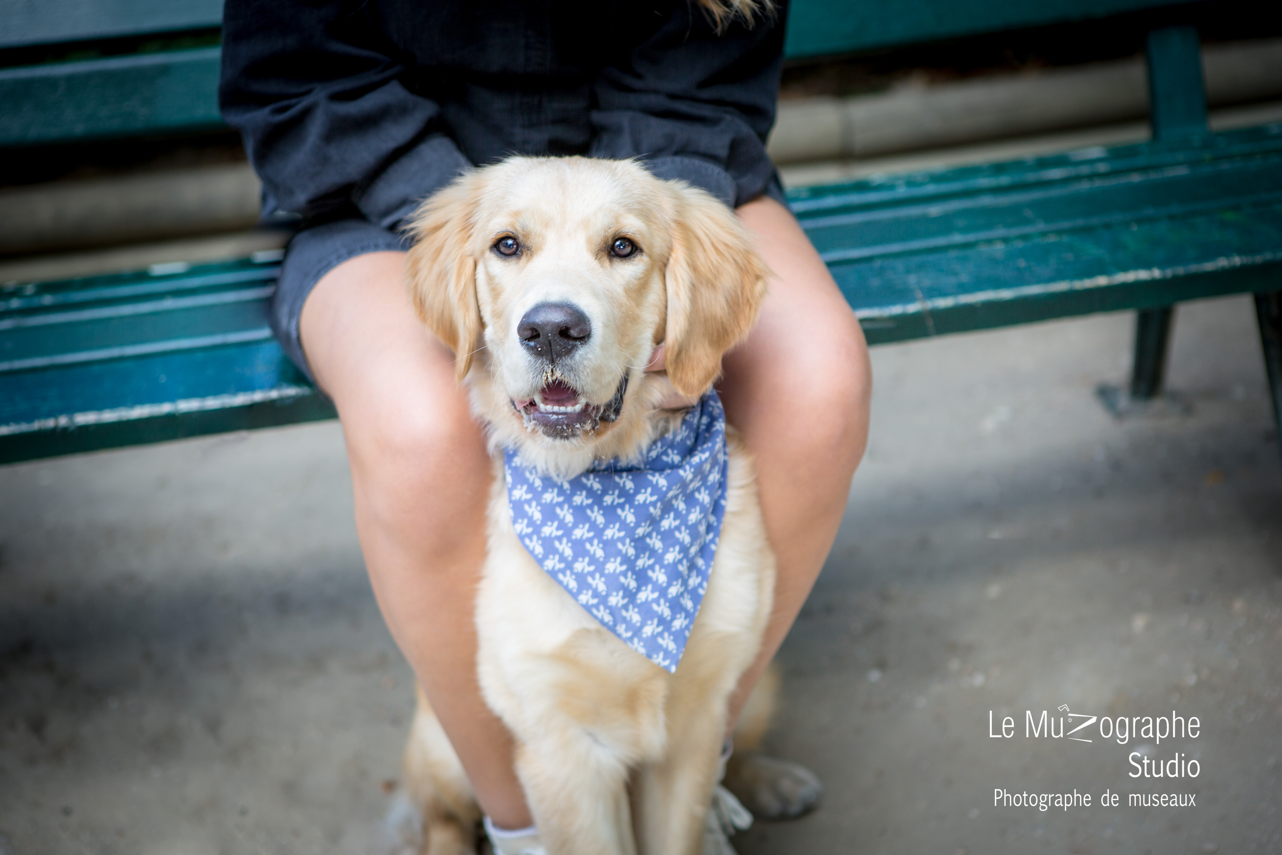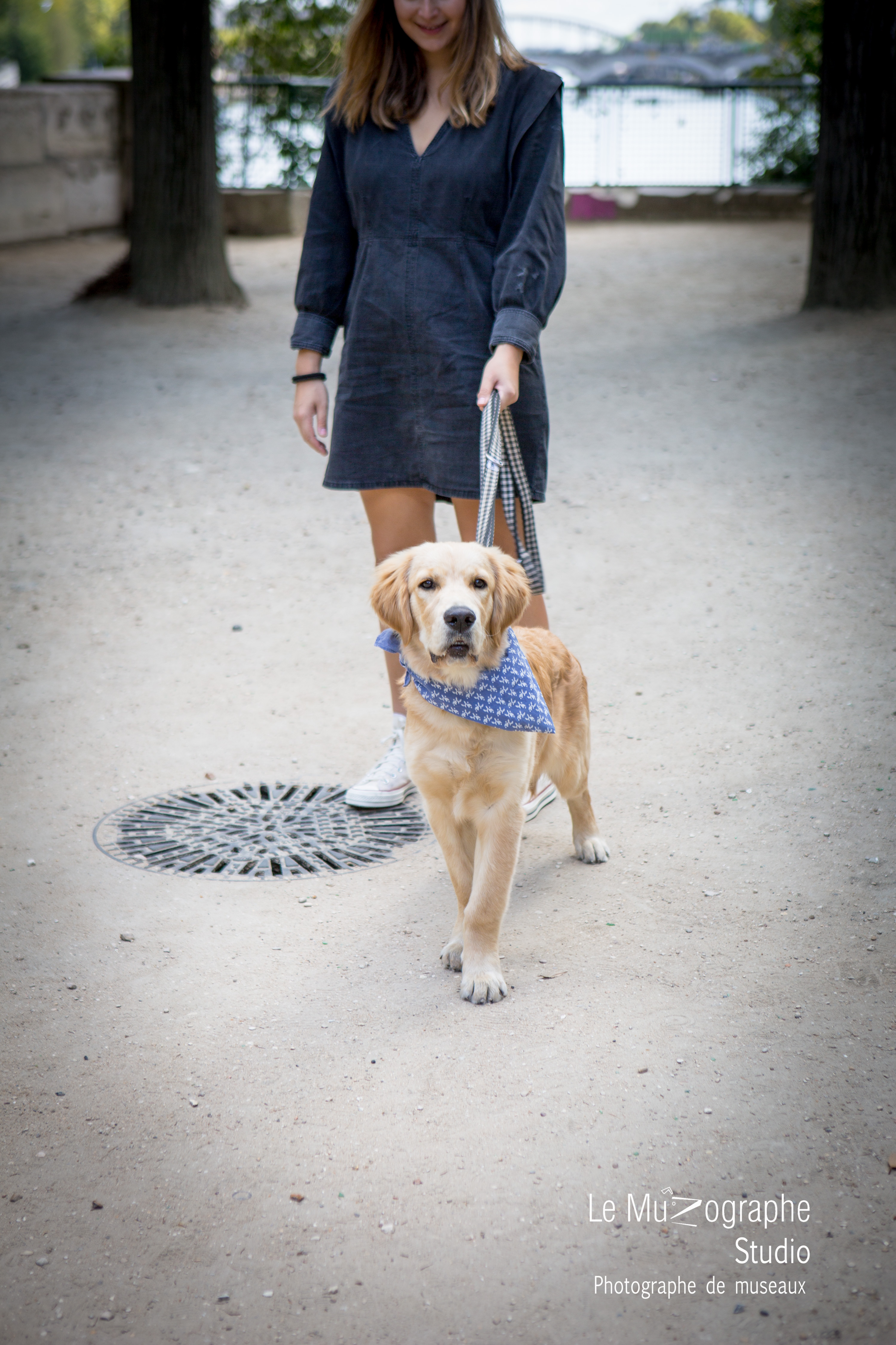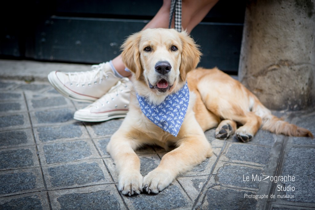 Comment ne pas craquer pour Scout et son foulard bleu, un adorable golden retriever de 6 mois. L’âge où tout est découverte, où tout est matière à jouer.