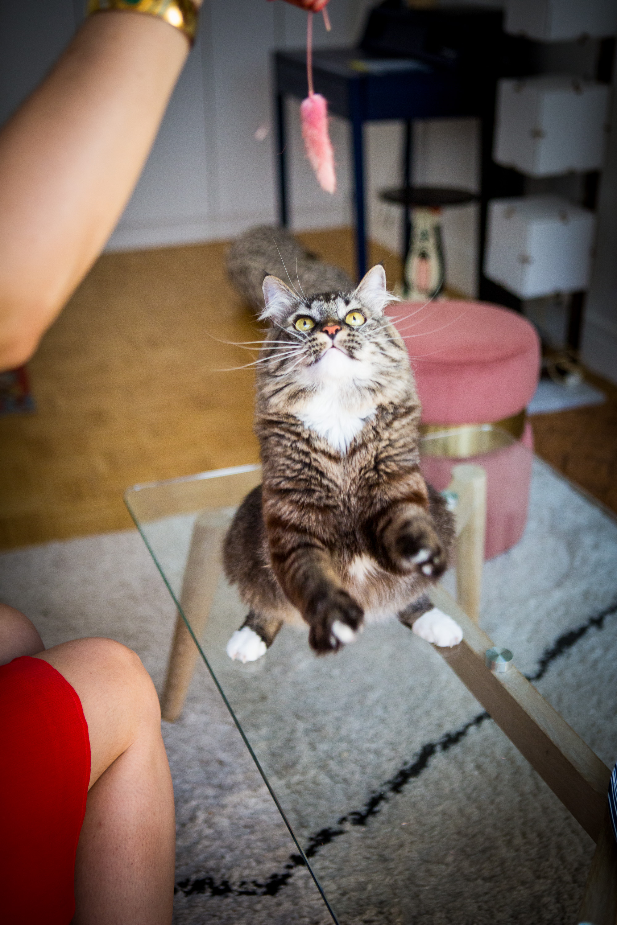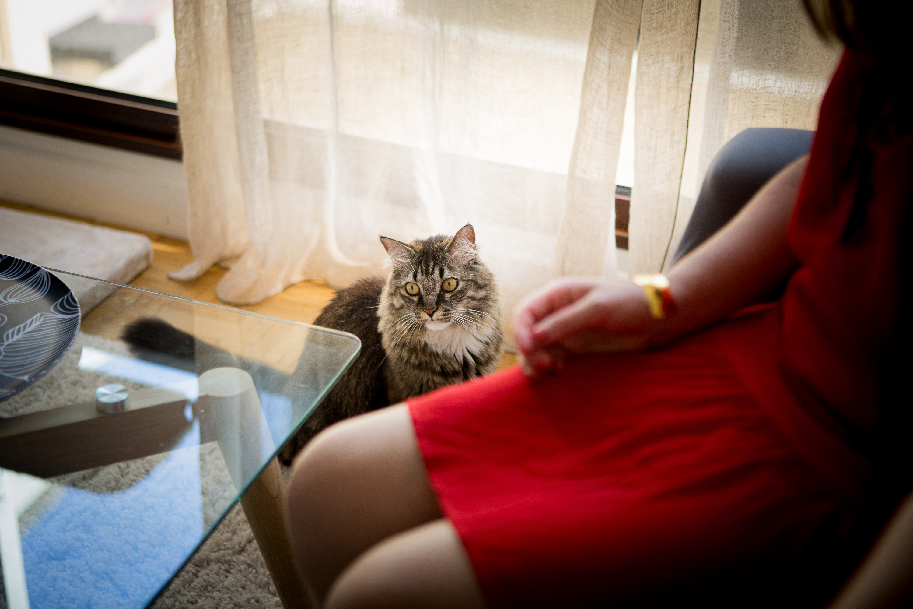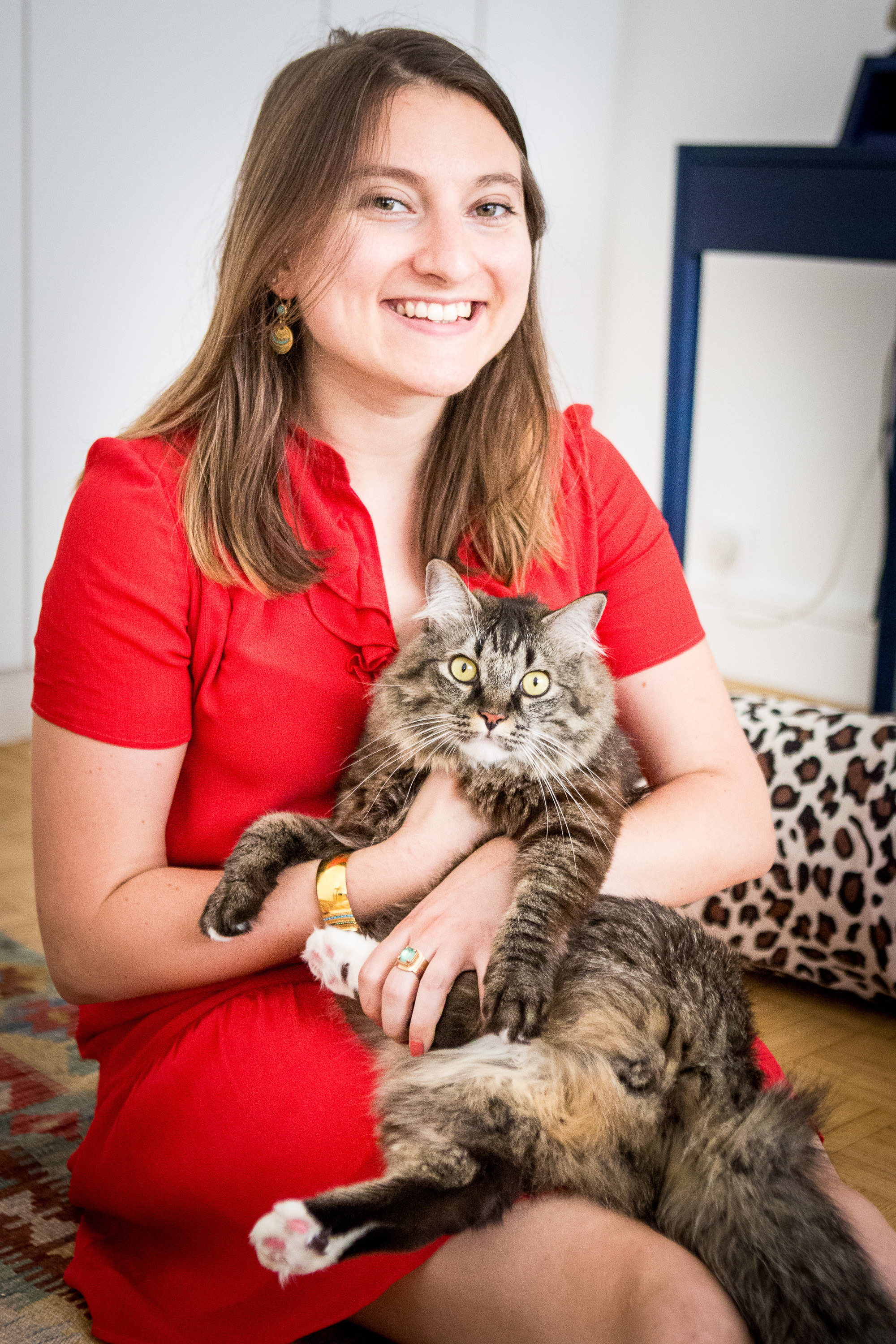 Pendant une heure, j’ai suivi Célia et Loulou dans leurs moments de complicité, leur quotidien. Loulou jouant, se promenant dans l’appartement, grimpant sur les meubles, posant sur le fauteuil jaune ou sur le canapé rouge. Célia lui murmurant des mots doux, une caresse par-ci, une papouille par là, un bisou entre les deux oreilles…